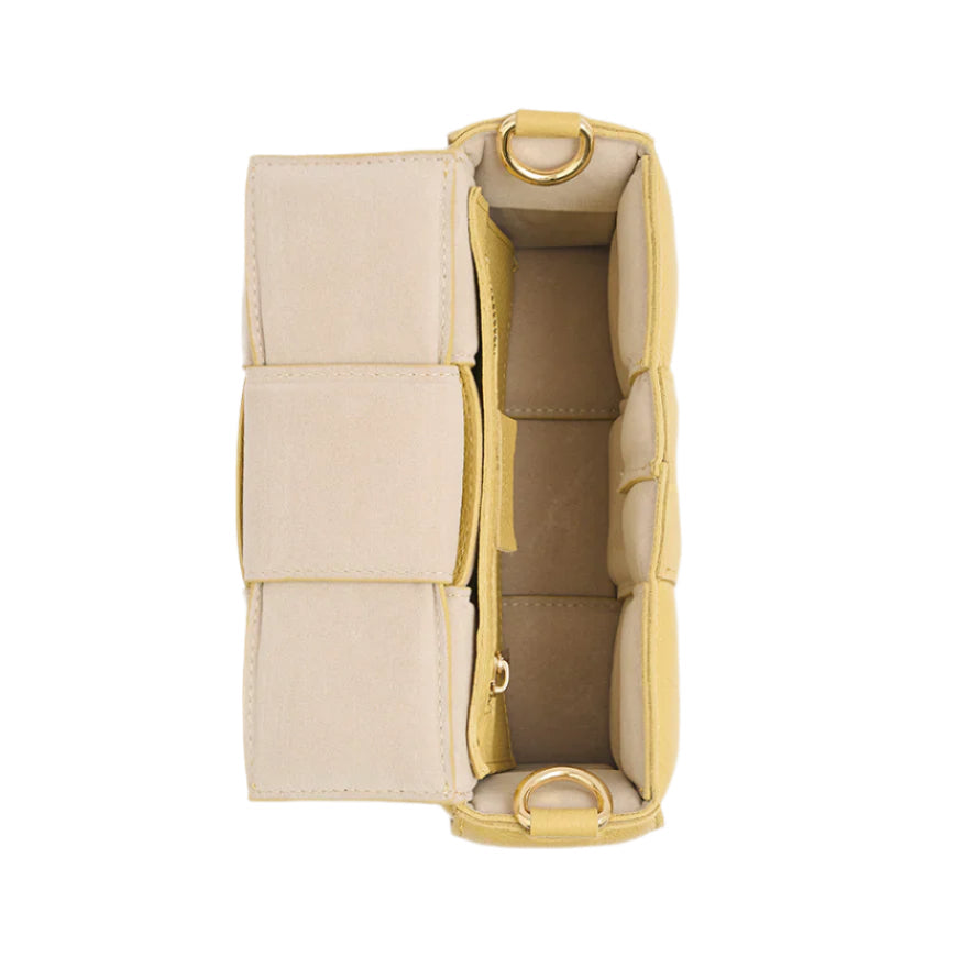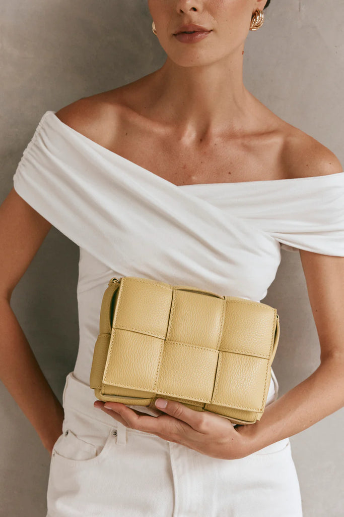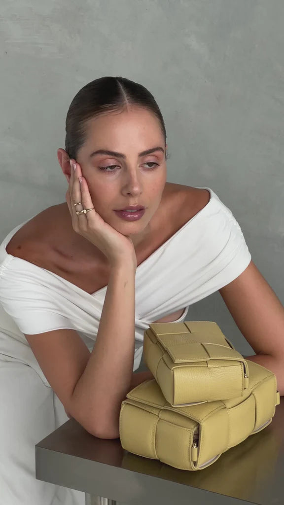 Woven Italian leather panels in a luxe padded, pebbled leather are the feature of this stunning statement bag. Complete with the choice of two straps, choose between a short chain or a long adjustable crossbody strap (both removable) depending on the occasion.