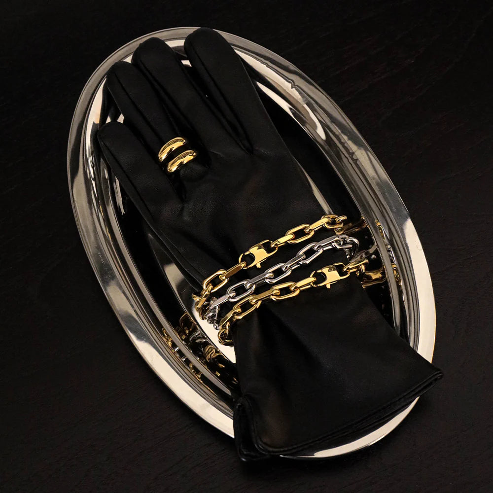 The Romy Bracelet by Zahar features oversized, high shine links for a sleek and sculptural look. Designed to stand alone or stack with your favourites, this chunky chain bracelet adds effortless edge to any outfit.