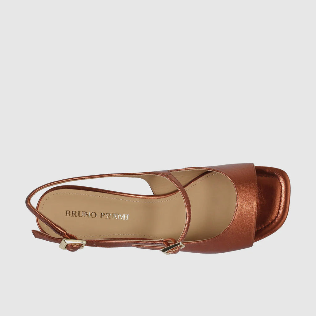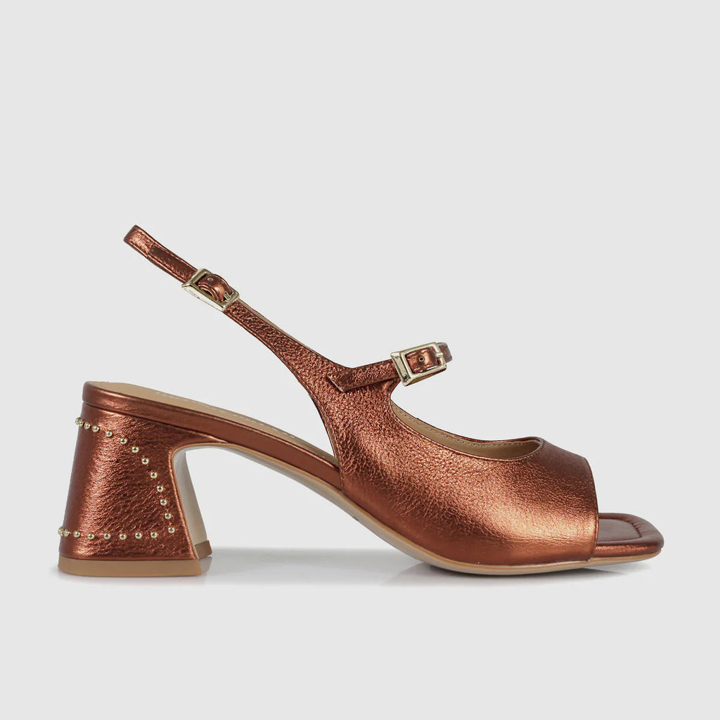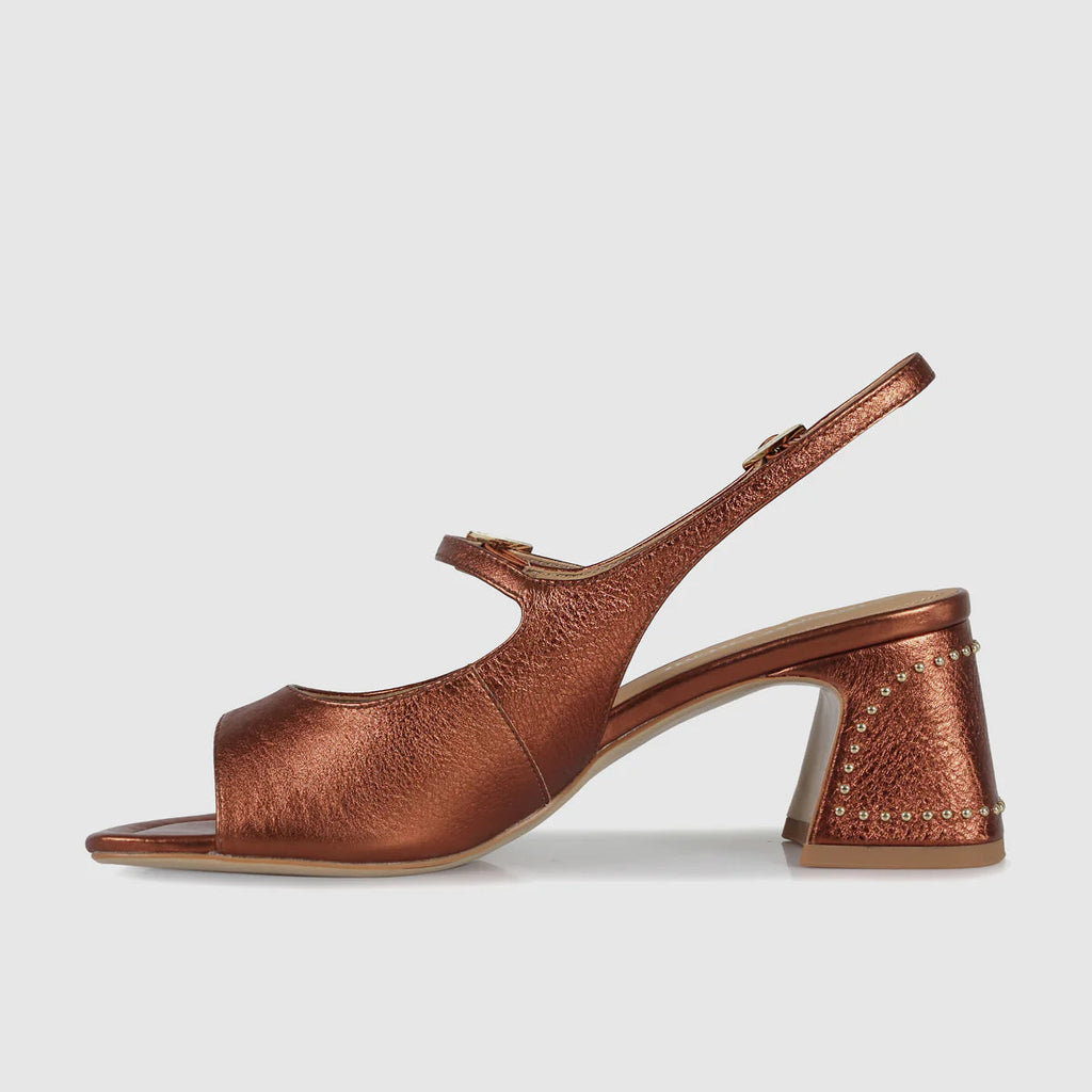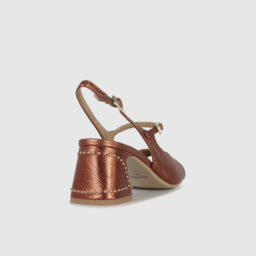 The Heria Slingbacks by Bruno Premi offer a bold reinterpretation of the classic block heel sandal. Crafted in striking metallic bronze leather, they feature a square open toe and a sculpted block heel embellished with studded detailing for a modern, glamorous edge. The double strap design with adjustable buckles ensures a secure fit, while a cushioned insole delivers lasting comfort from day to night.