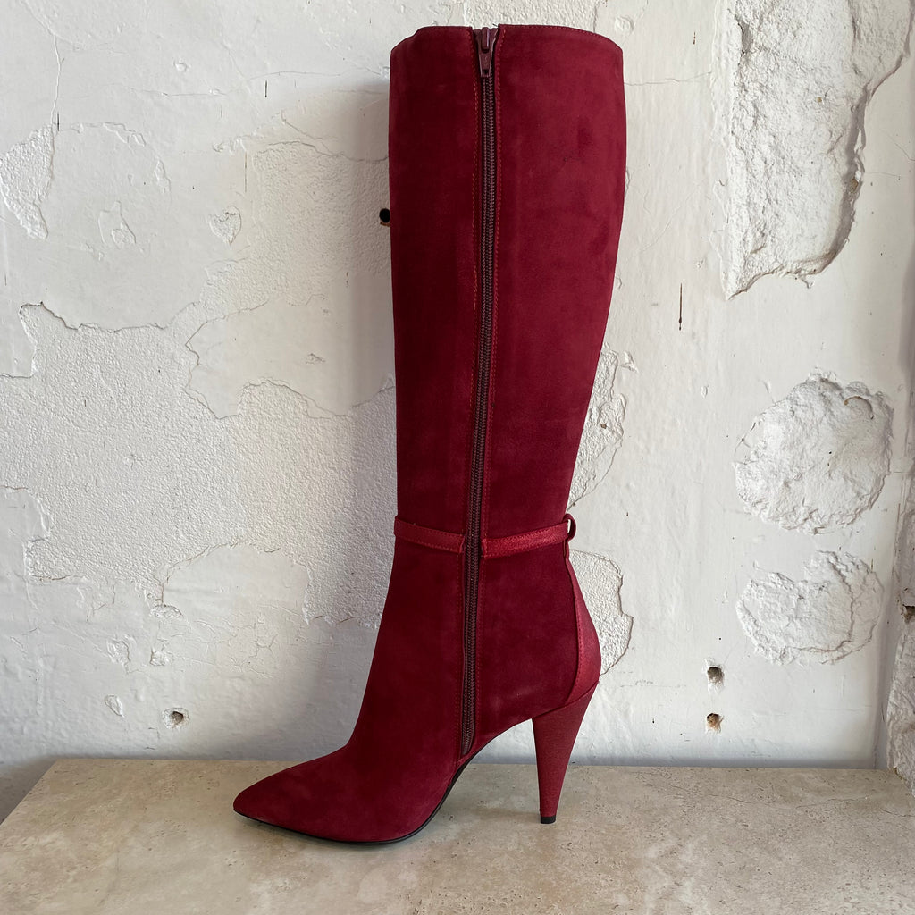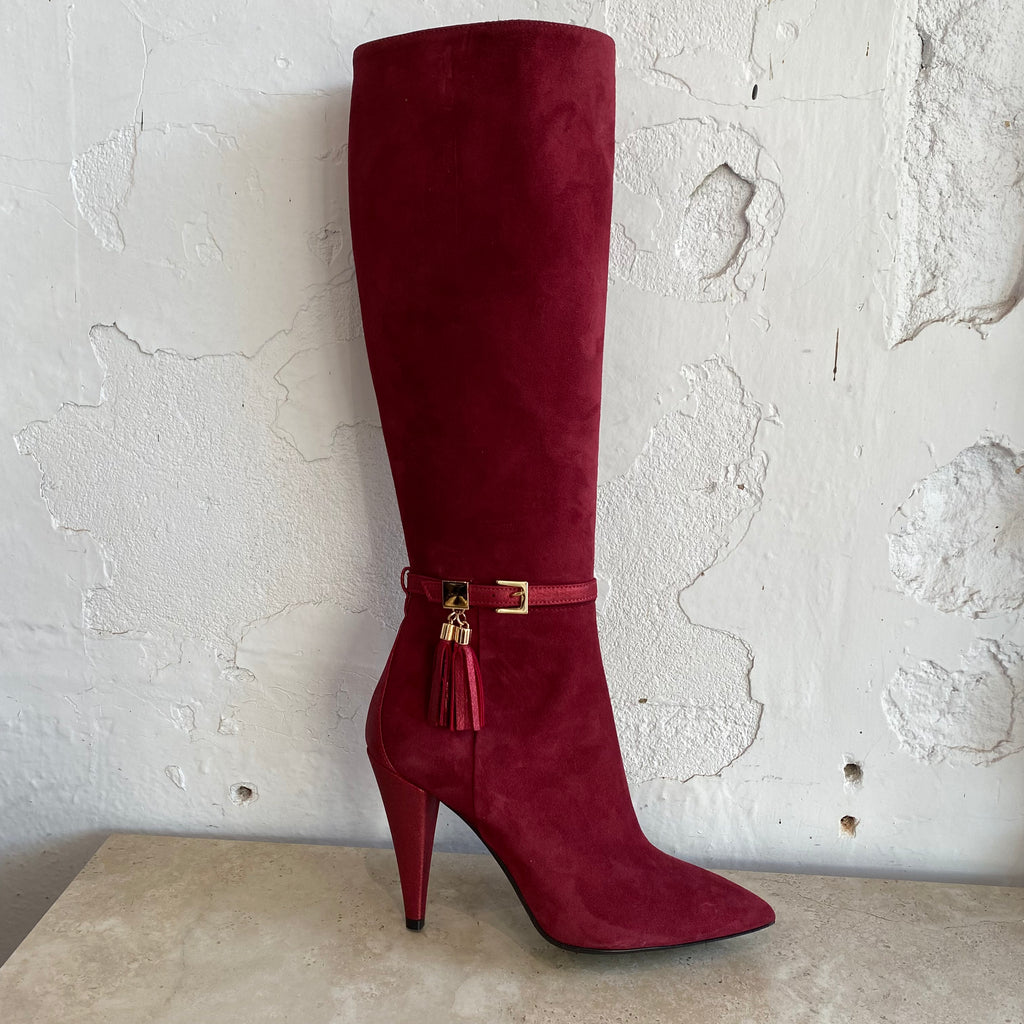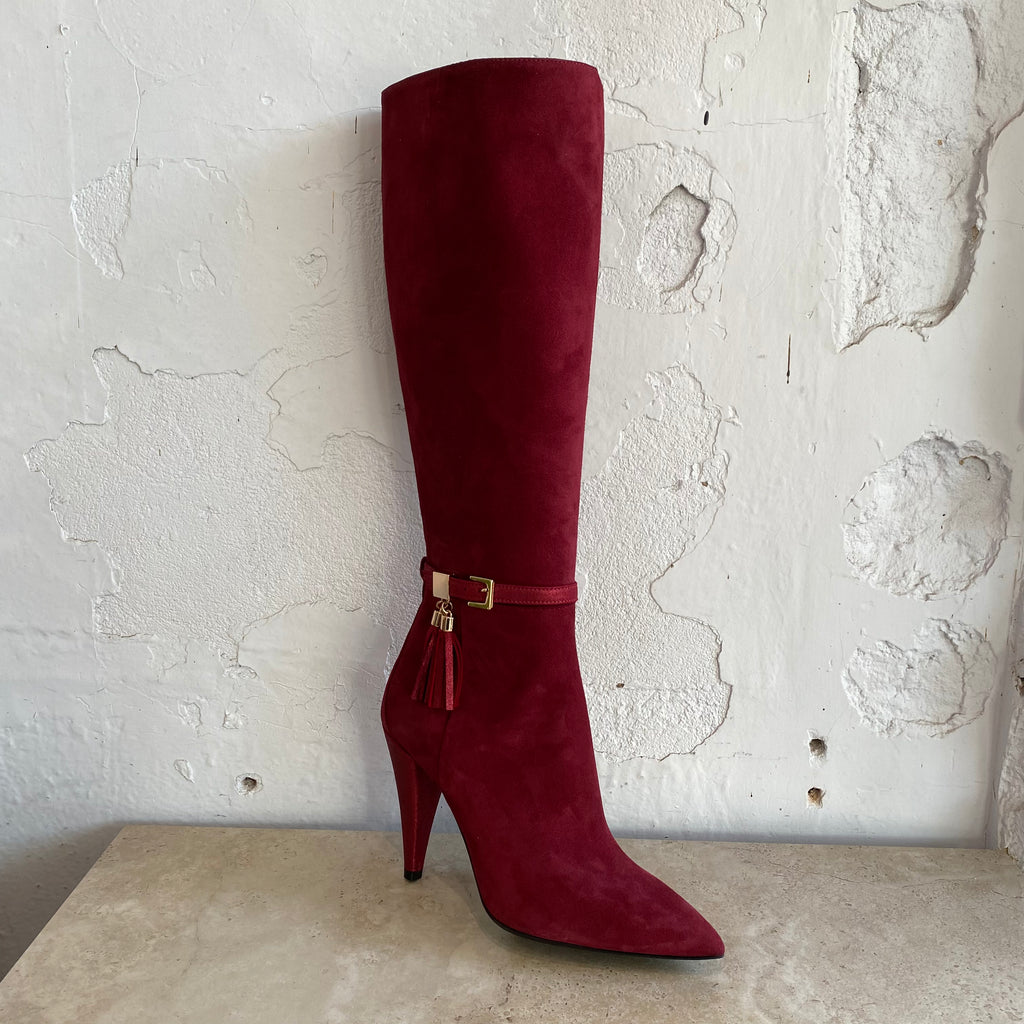 Introducing the ultimate statement boot! This bordeaux suede knee high boot by Isabelle Paris features a buckle with a shimmer suede tassle and gold detailing, 4-inch shimmer suede heel, pointed toe and side zip.