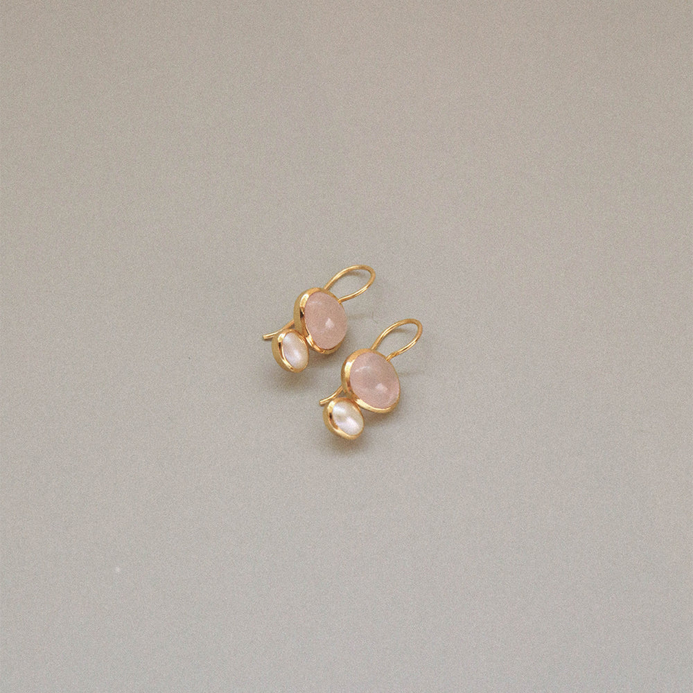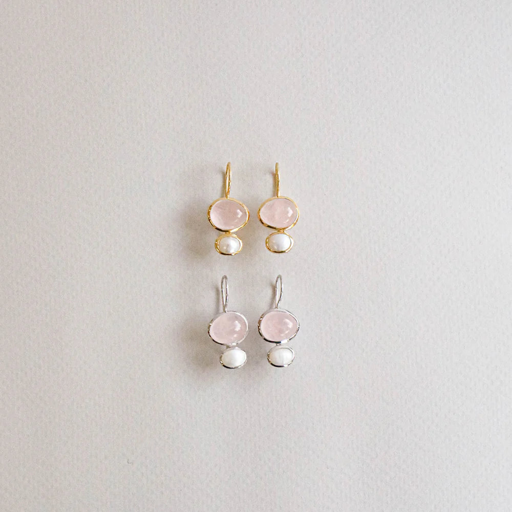 The Cubism Earrings by Bianc feature two primary gemstones, Rose Quartz in an oval setting, and freshwater pearl in a smaller round setting below, set and suspended in 18k gold plated sterling silver. These earrings are the perfect blend of modern design and timeless charm, ideal for those who love effortless sophistication.