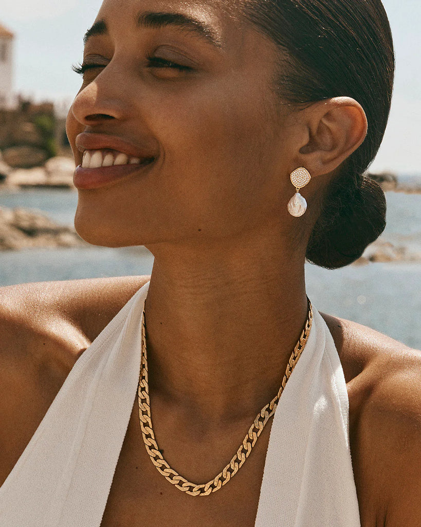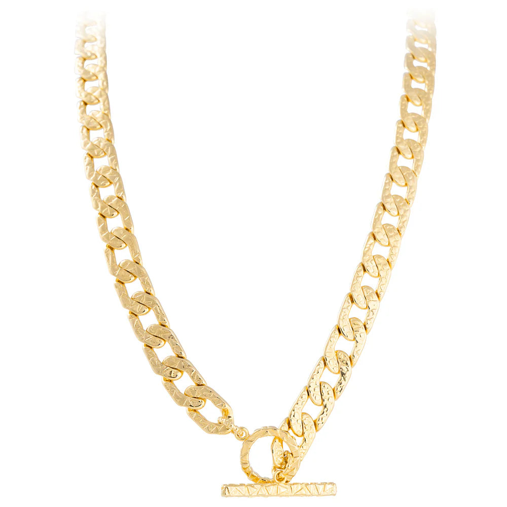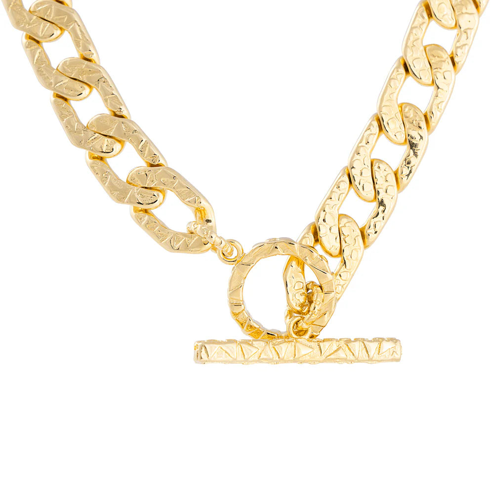 Vintage-inspired with a modern twist, the Antique T-Bar Crystal Necklace is a bold statement piece with timeless appeal. It features a wide antique hammered chain and T-bar accented with two delicate round white cubic zirconia for a subtle touch of sparkle. A modern heirloom designed to shine.