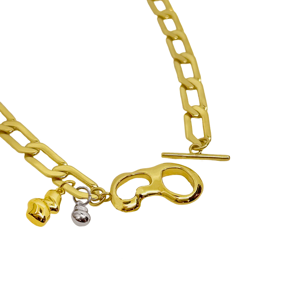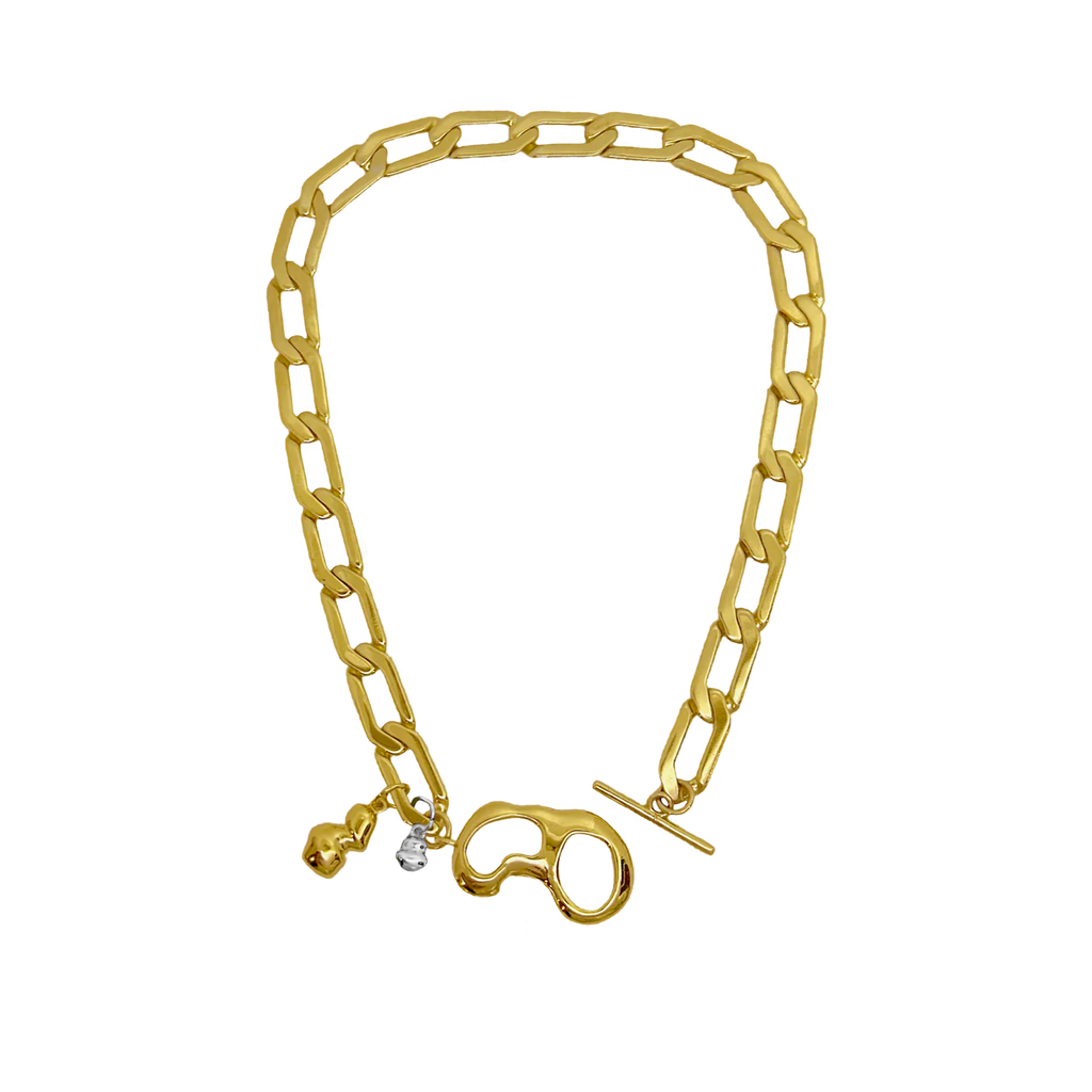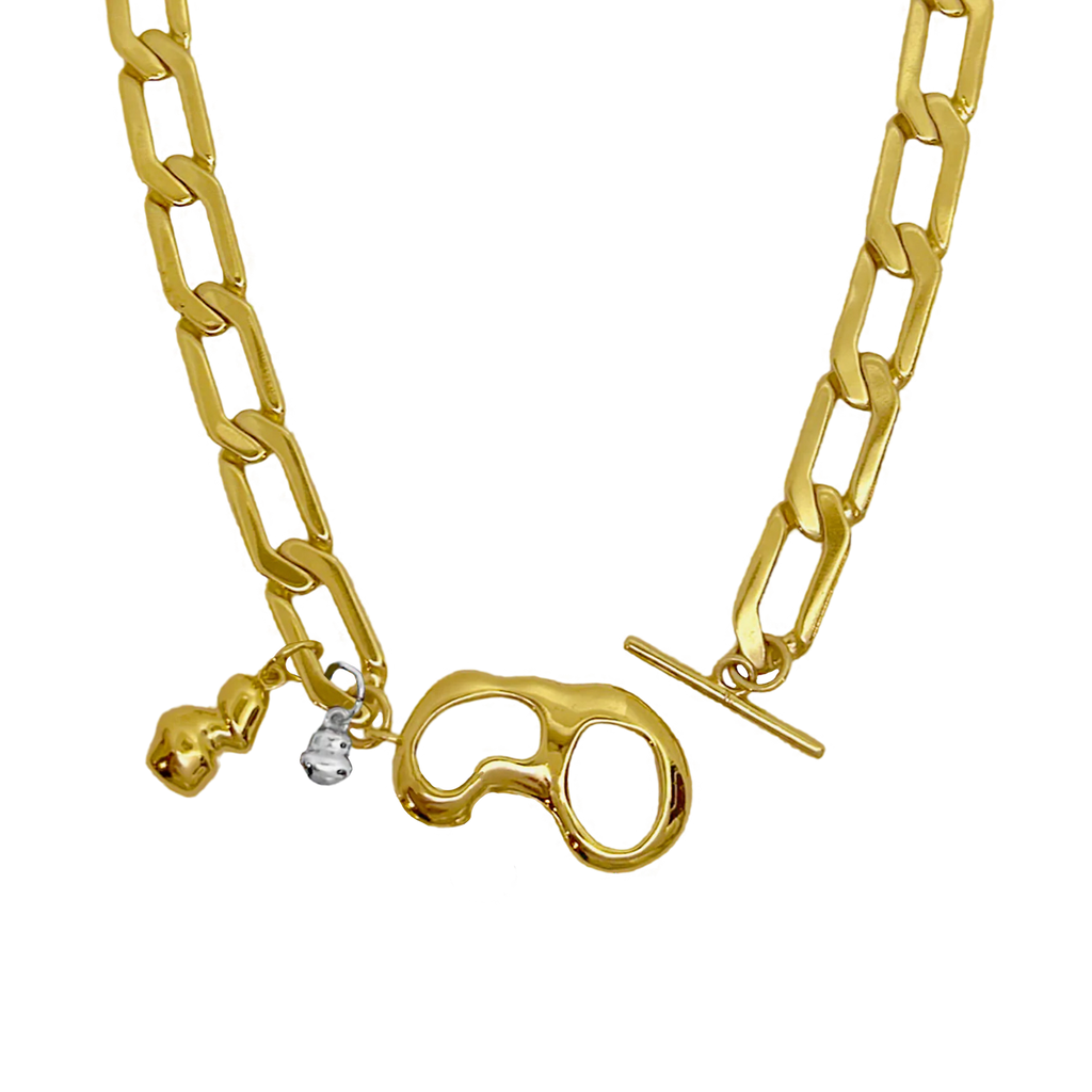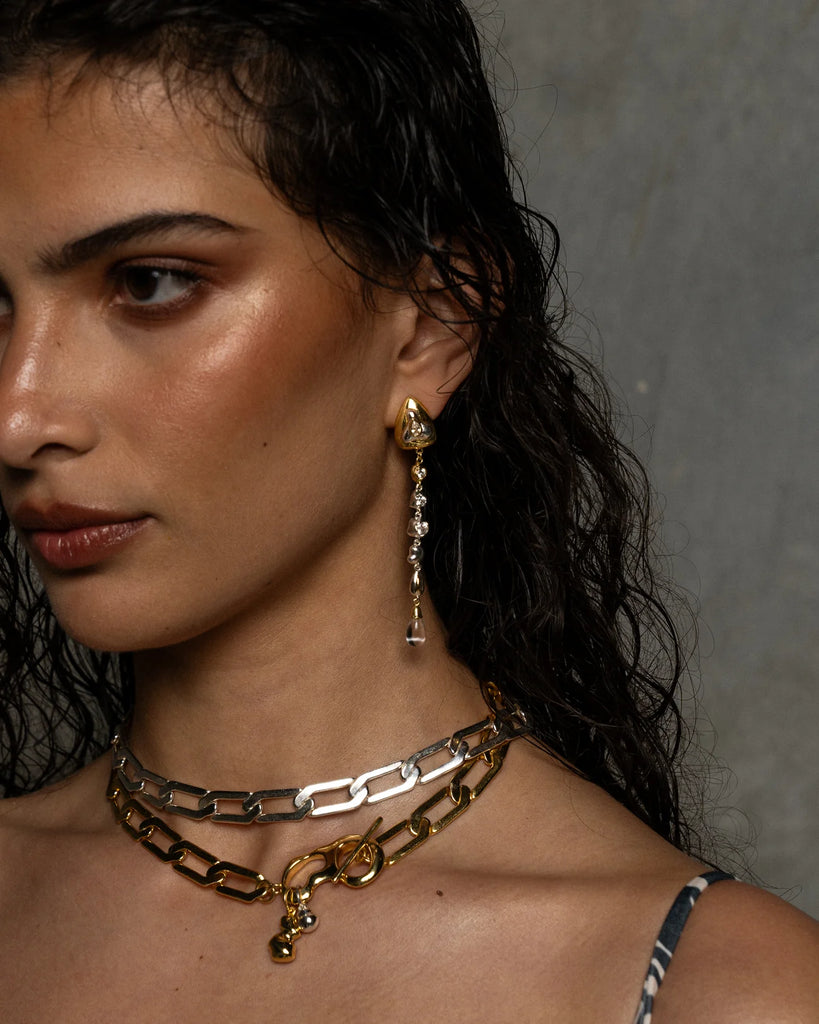The EVERLEIGH Necklace in Gold commands attention... She exudes strength, sophistication with a hint of 'effortless cool girl' what more could we ask for!? Boasting a beautifully unique t-clasp designed around a fluid motif, adorned with droplets of mix metals, nestled between a chunky angular link chain, evoking the balance between hard and soft. Effortlessly layered or a standout all on her own. The Everleigh Necklace is that unique piece you've been searching for!