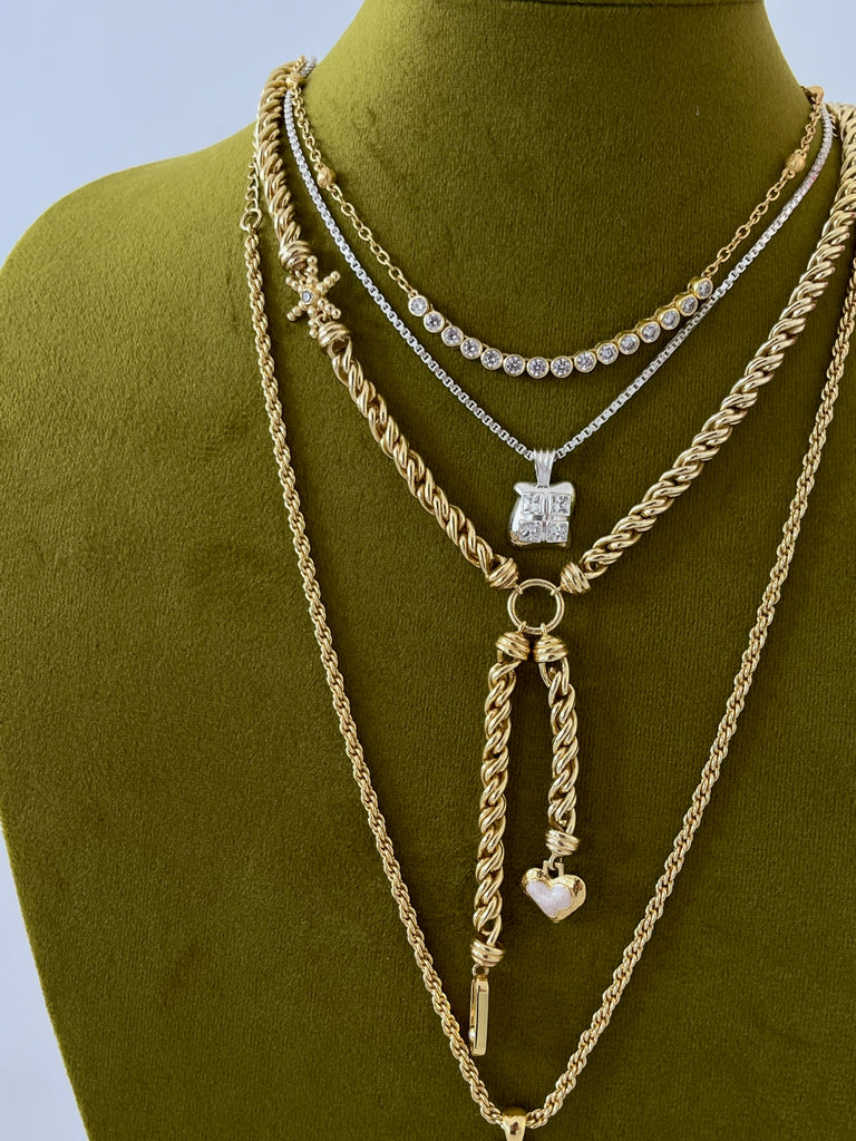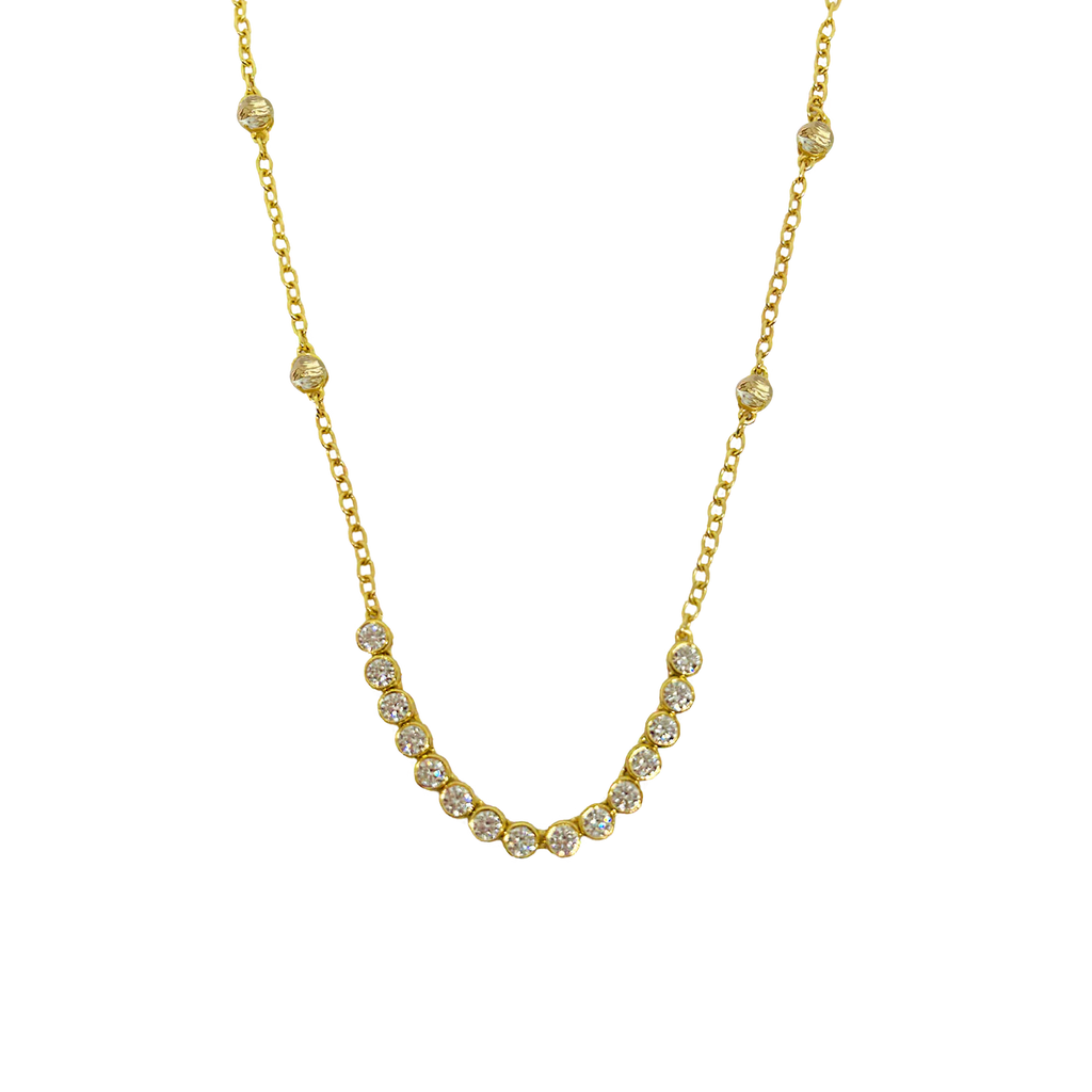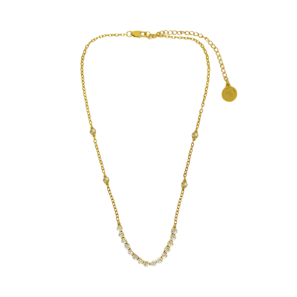 Introducing the IVY Necklace in Gold... Our take on the classic tennis necklace combines glamour and antique charm with a modern twist. The design features exquisite, vintage-inspired white CZ set in intricate, antique-style bezels that showcase their brilliance with a timeless elegance. The chain features our signature textured ball work, offering a modern, bold edge while maintaining that classic allure. Worn as a statement piece on her own or layered for a more personalised and dynamic look. You'll never want to take her off!