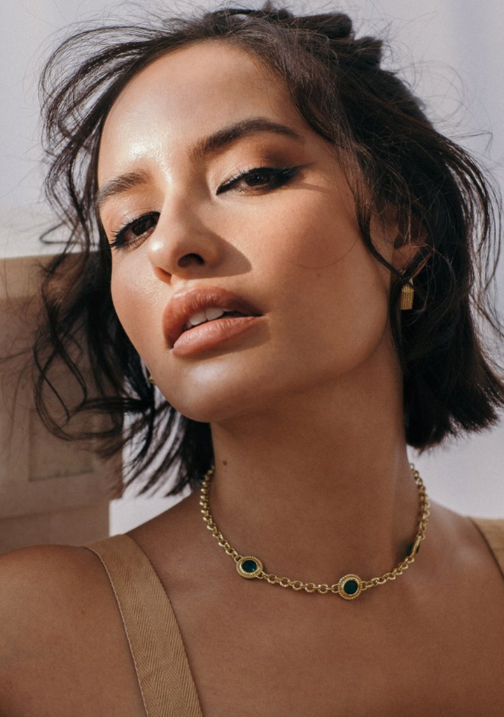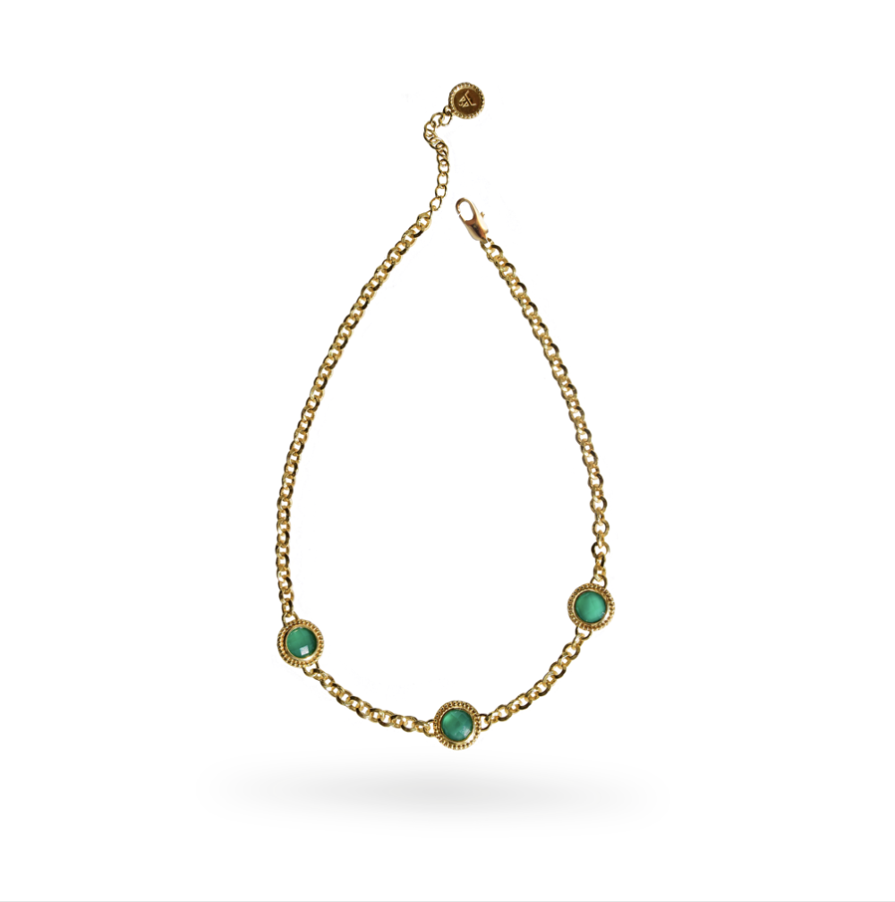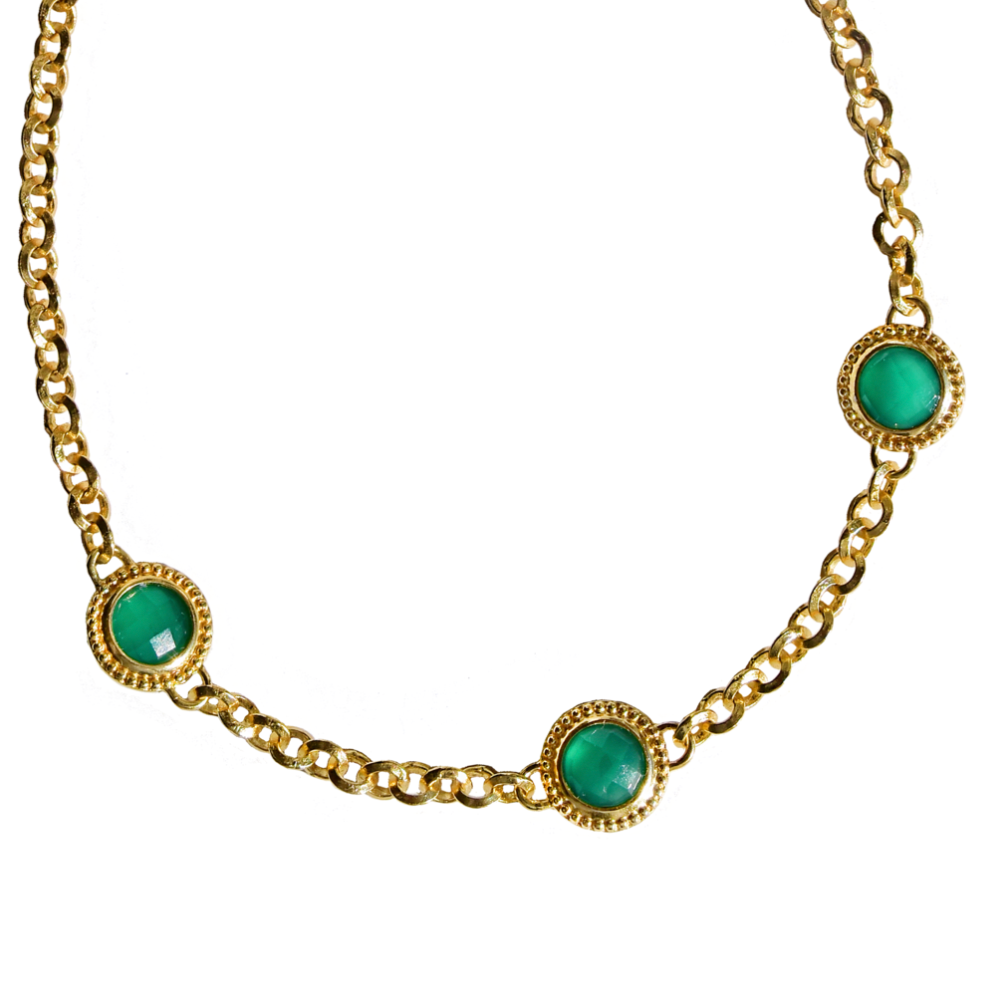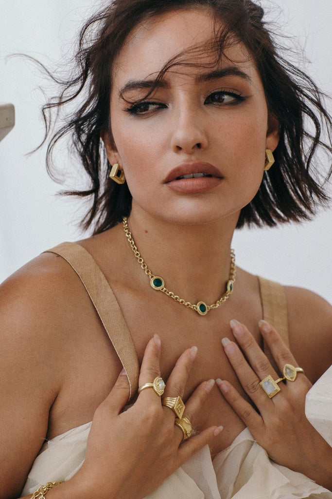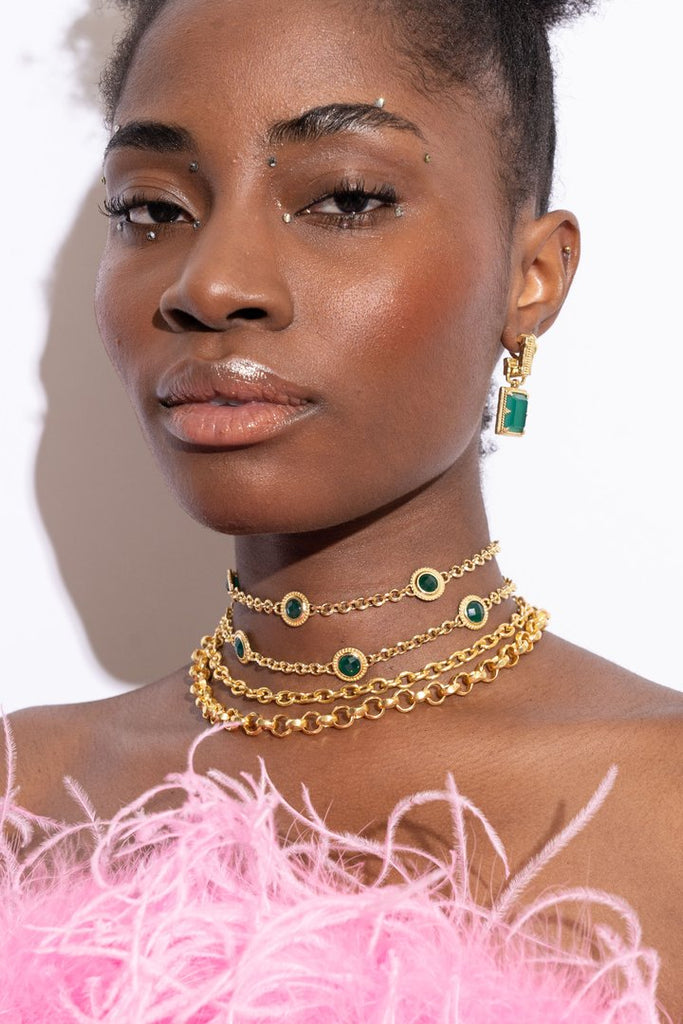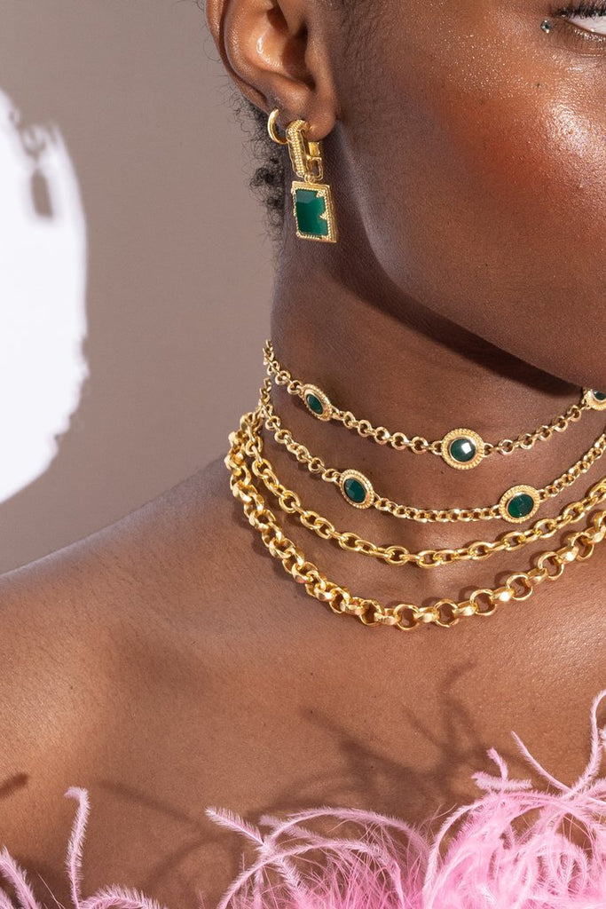 Make them green with envy for your new favourite layering chain, the Tijana! Gorgeous green onyx stones dazzle on this necklace that looks stunning layered with our thinner chains and bold gold pieces, or Tijana really holds her own as a single statement style adorning your neckline.