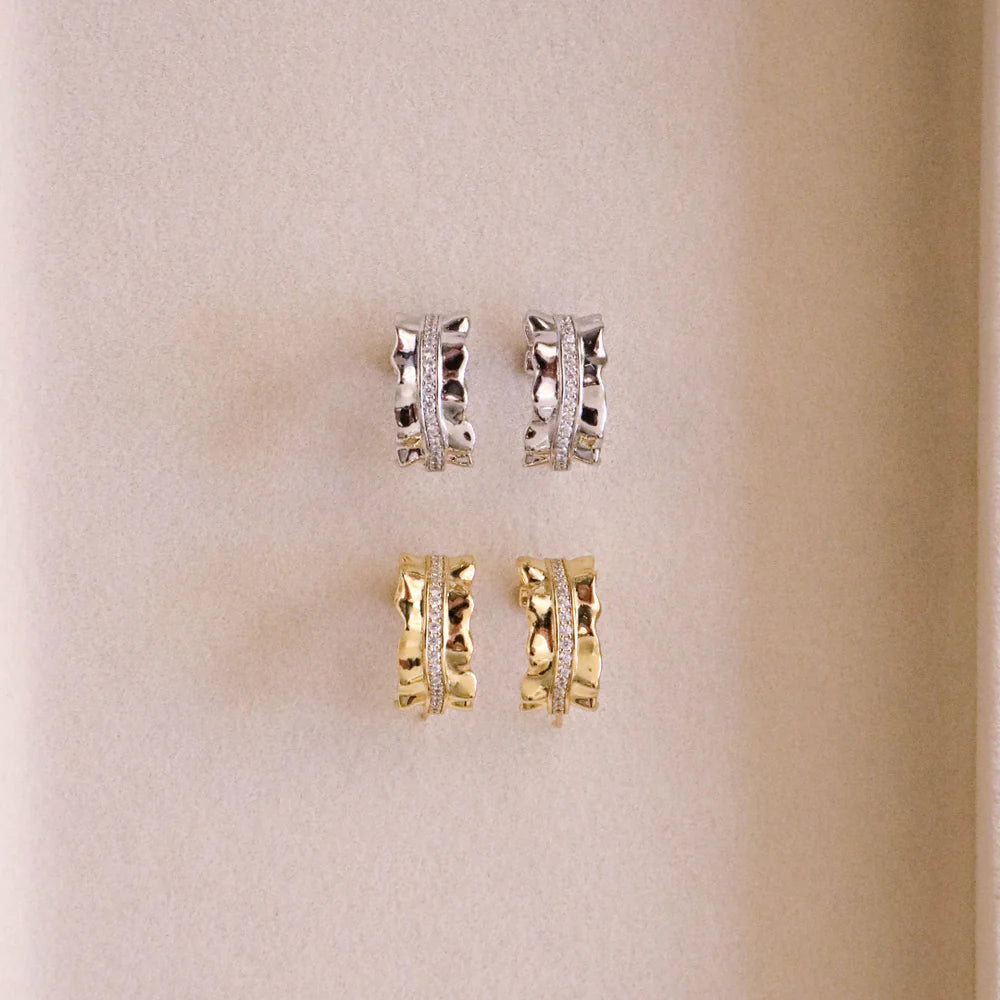The Astro Earrings by Bianc feature a sculptural wave-like hoop design set in rhodium plated sterling silver. A fine centre band of pavé-set cubic zirconia adds a subtle sparkle, creating the perfect balance of shine and texture. Lightweight and easy to style, these hoops are a sleek upgrade to your everyday jewellery lineup.