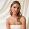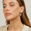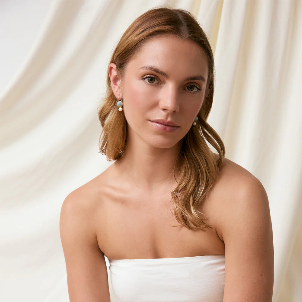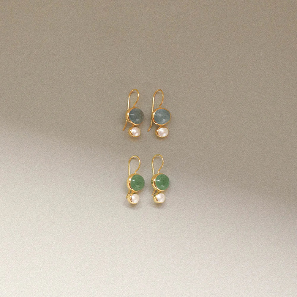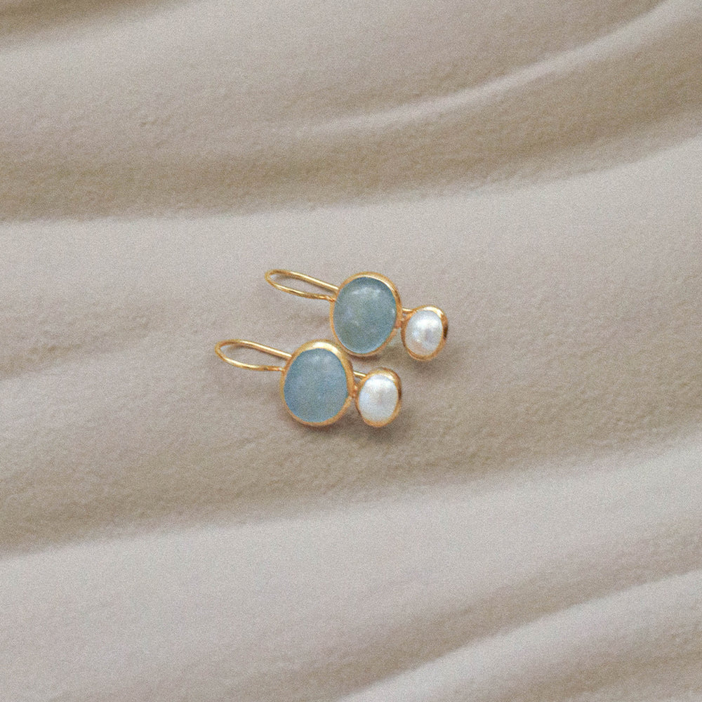 The Cubism Earrings by Bianc feature a drop earring of Milky Aquamarine Cabachon and a Freshwater Pearl all set in 18k gold plated sterling silver.