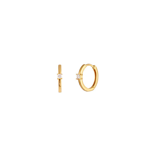 The Elsie Earrings by Bianc are delicate huggie hoops adorned with a single sparkling cubic zirconia at the centre. Set in rhodium or 18k gold plated sterling silver, their clean design makes them perfect for everyday wear - whether styled alone for subtle shine or layered with other pieces for a curated ear look.