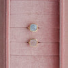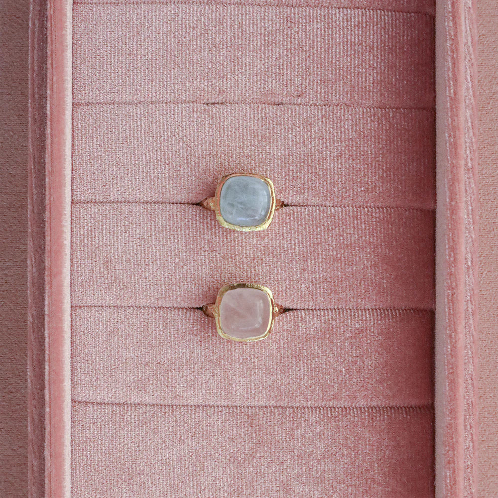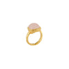 The Hue Ring by Bianc features a smooth Rose Quartz cabochon set in textured 18k gold plated sterling silver.