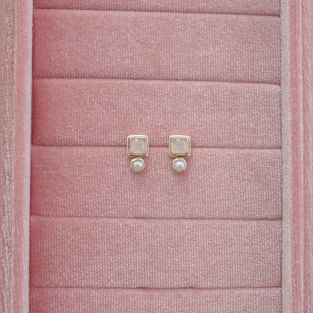 The Impressionist Earrings by Bianc feature a soft blush-toned Rose Quartz stone paired with a luminous freshwater pearl drop, set in 18k gold plated sterling silver.