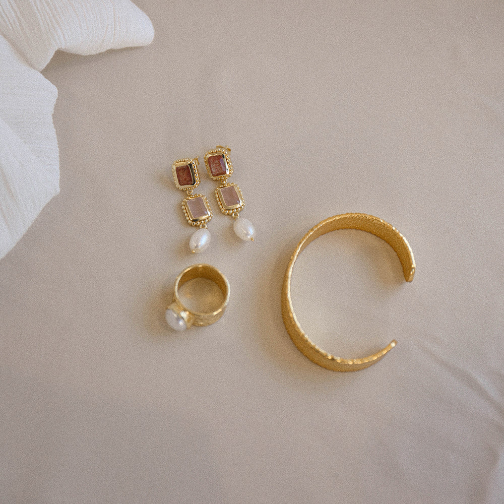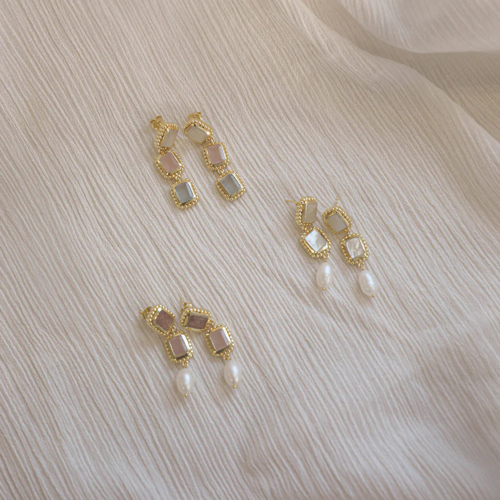The Maricar Earrings by Bianc are a statement 3 stone drop featuring Strawberry Quartz, Rose Quartz, Freshwater Pearl set in 18k gold plated brass. Sterling Silver Earring Posts.