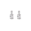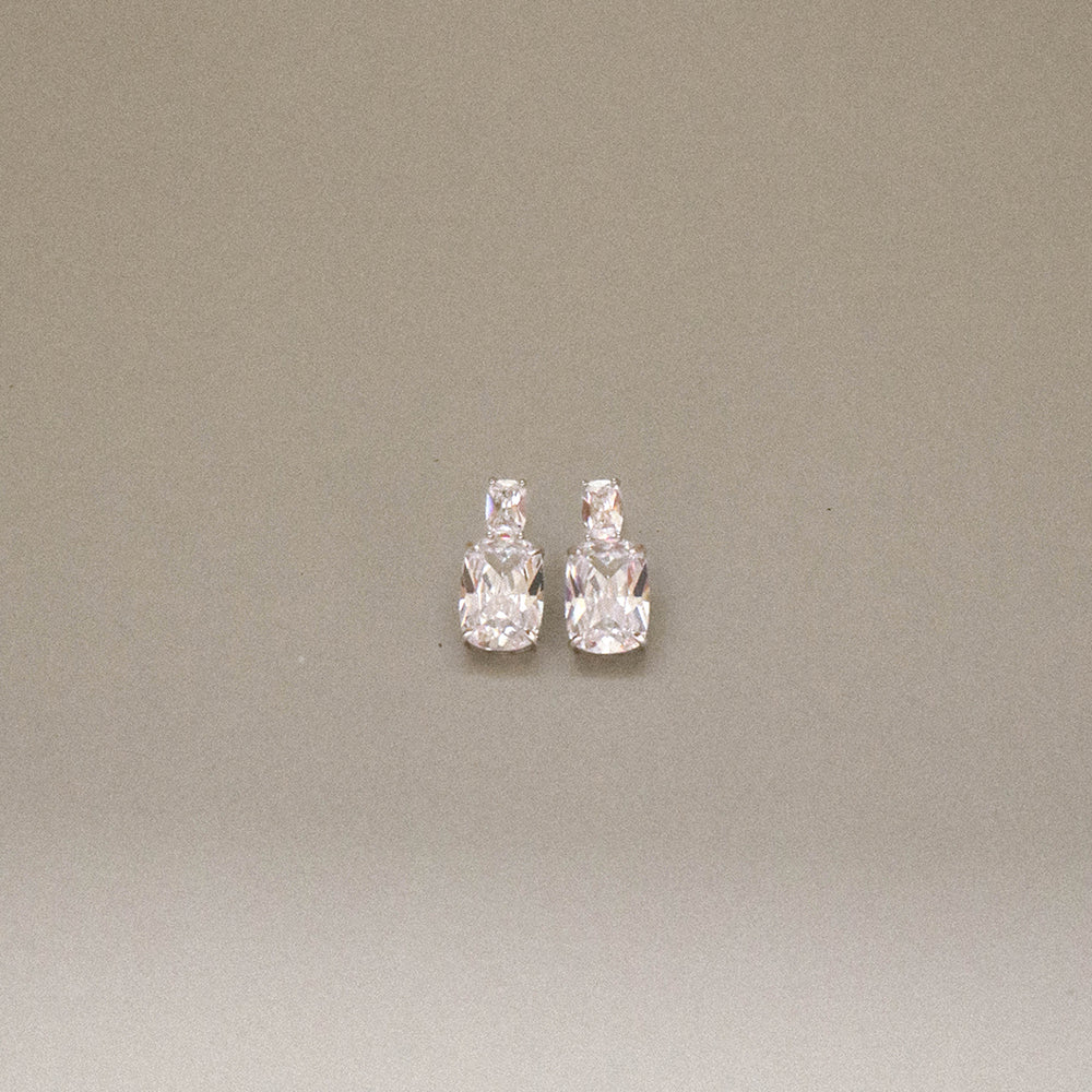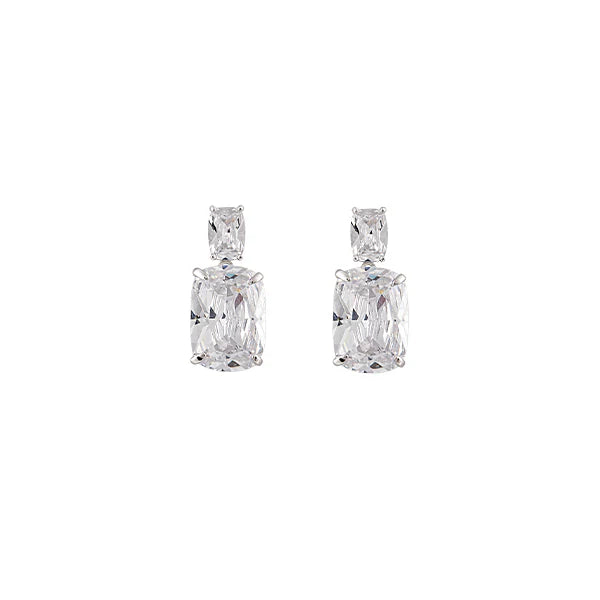 The Nova Earrings by Bianc feature a classic double-drop style with a radiant cushion-cut cubic zirconia suspended below a sparkling square-cut smaller cubic zirconia stone, to add a dazzling touch of sparkle to your collection.