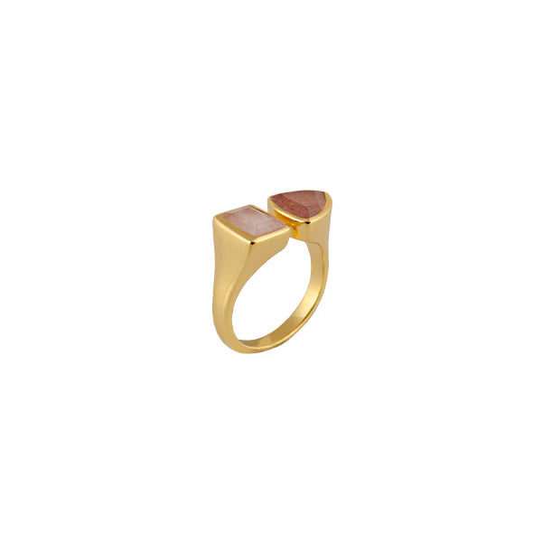 The Wildflower Ring by Bianc pairs two contrasting gemstones, a soft Brazilian Rose Quartz and rich Strawberry Quartz  set in a sleek open-top setting of 18k gold plated sterling silver.