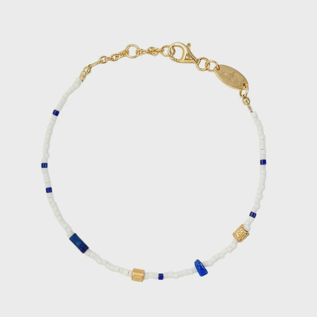 Fresh white, ocean blue with gold plated beads. Your everyday holiday.