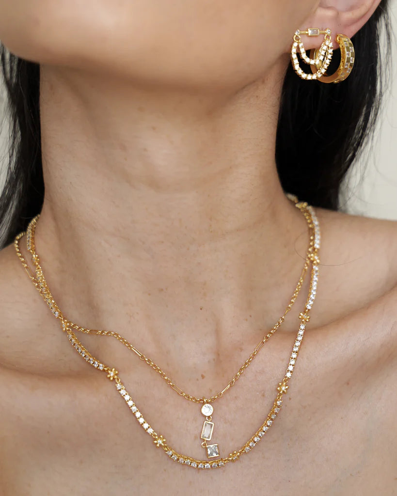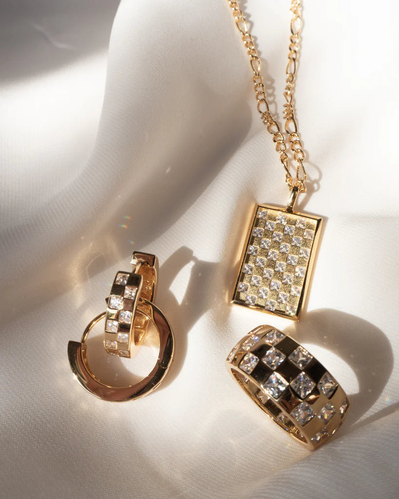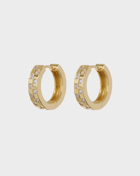 • Pair of mid-size, metal hoops with checkerboard patterned pavè