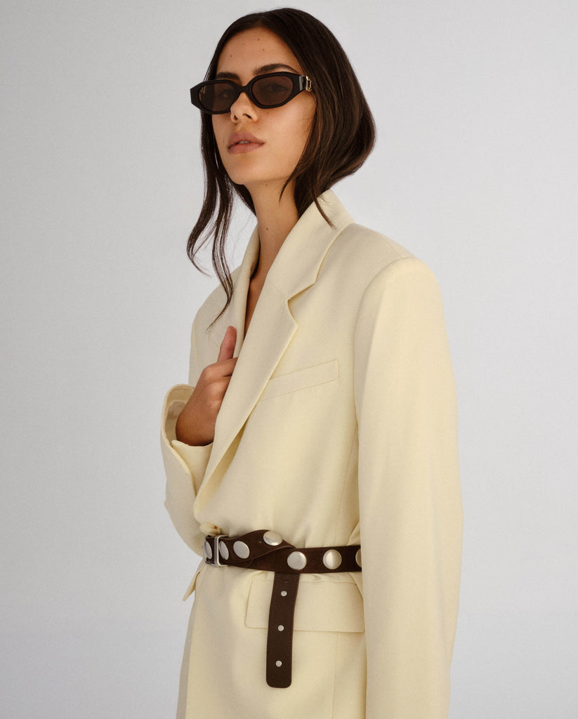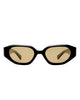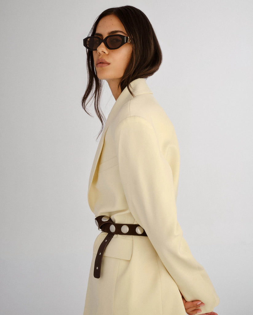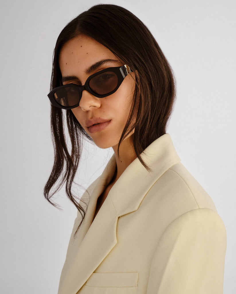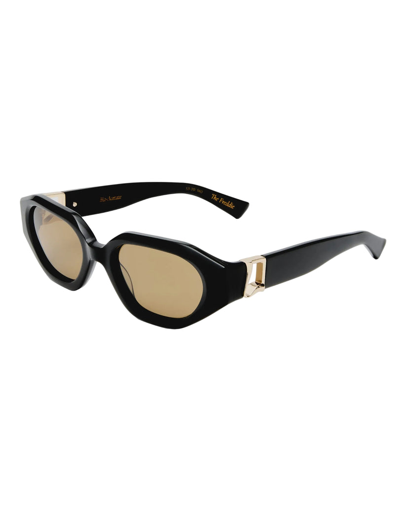 A statement silhouette for the modern muse. The Freddie reimagines the classic frame with a soft hexagonal shape and bevelled edges that catch the light from every angle. Bespoke organic L gold detailing at the temples adds a touch of polish, making this style feel both directional and refined.