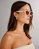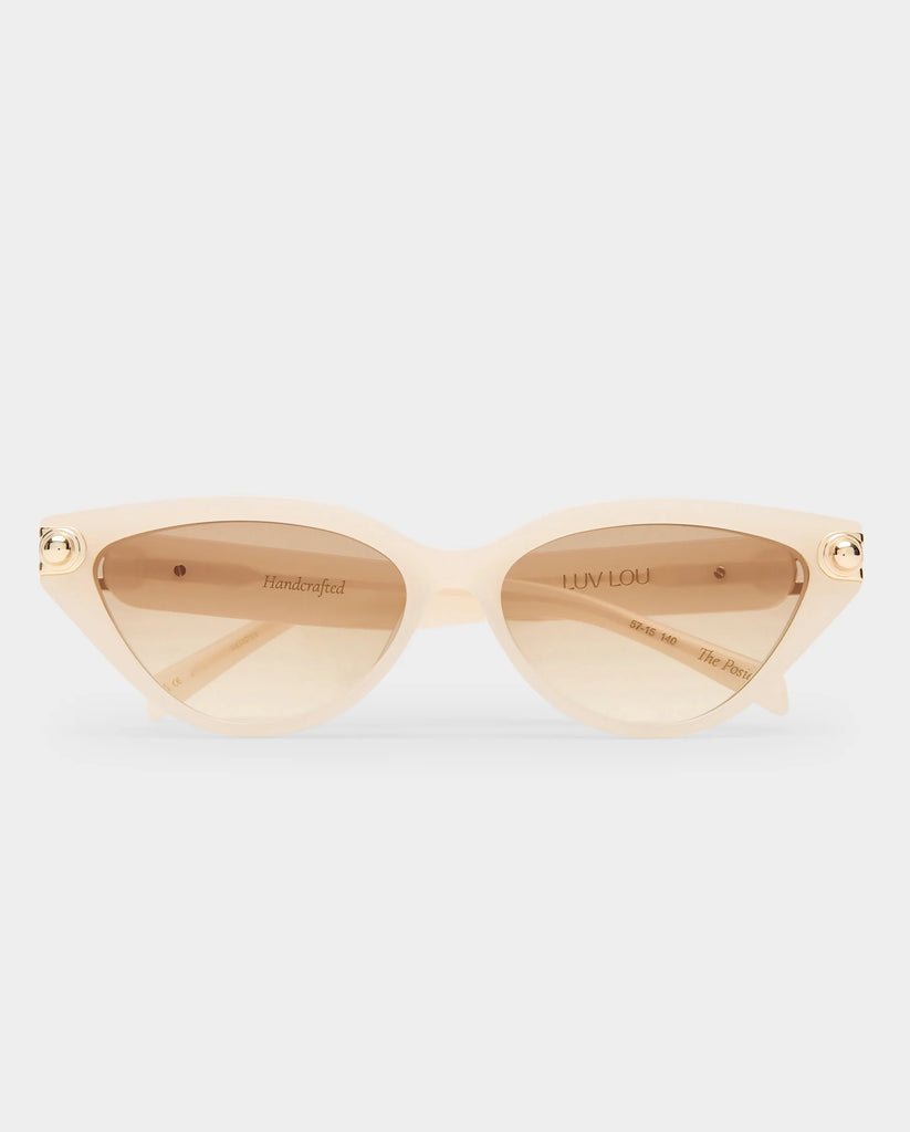 The Posie is a sharp cat-eye frame featuring luxurious spherical hardware on the front of the frame and elevated gold joinery creating a chic structural design. This frame is a modern take on the classic cat eye.