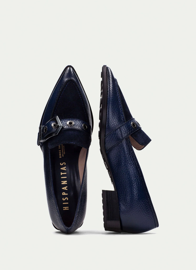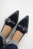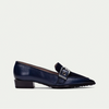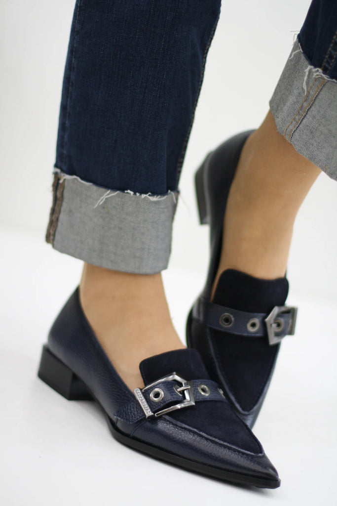 A modern update on the classic loafer, this pointed-toe flat is crafted from smooth leather and finished with a bold maxi buckle and eyelet detailing across the instep for a statement touch.