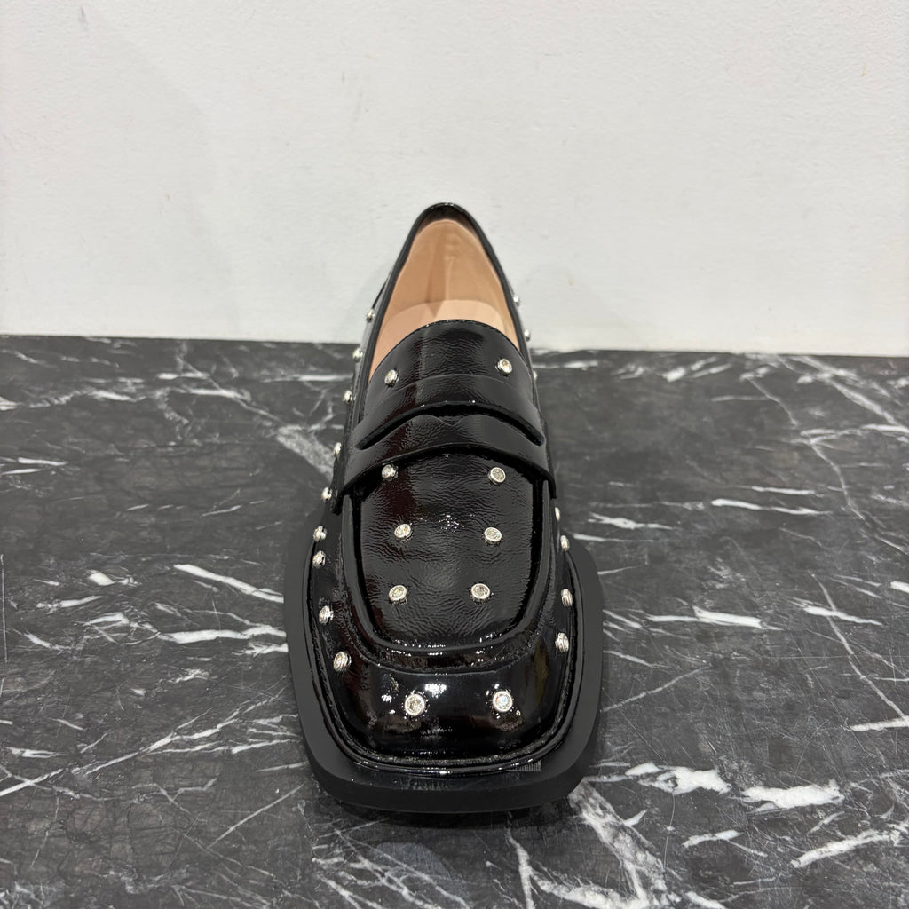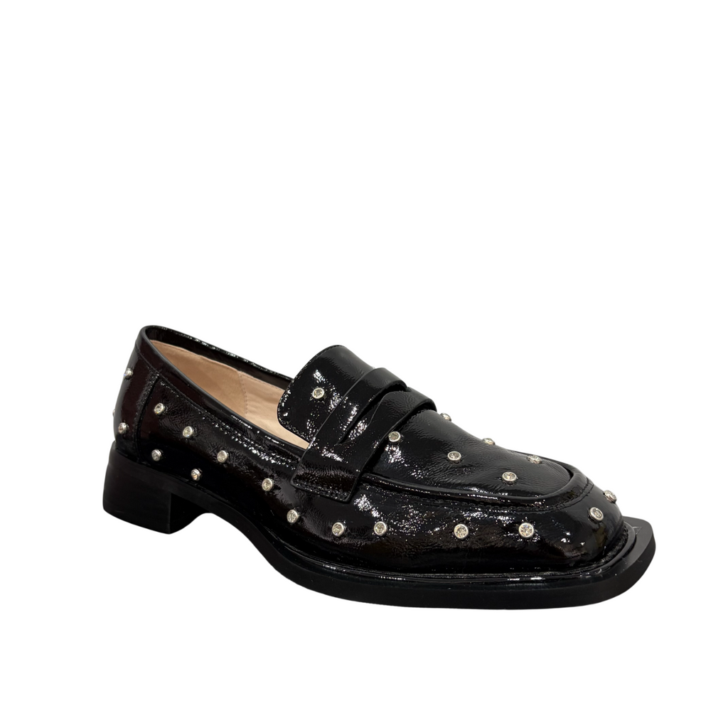Polished with a playful edge, the Mista loafer by Mila Raine elevates a classic silhouette with glossy leather and sparkling stud detailing. Combining timeless style with modern embellishment, it’s the perfect statement flat for everyday sophistication.