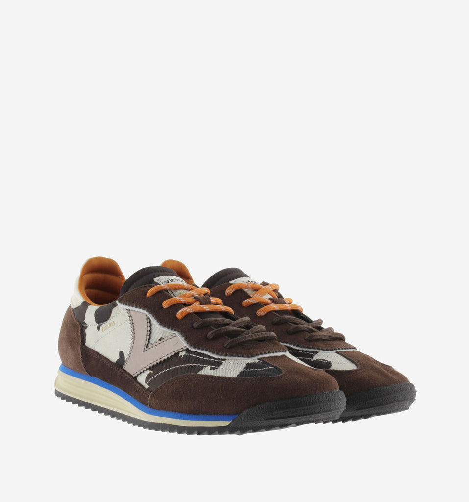 Animal print women's trainers made from nylon with suede overlay panels. Metallic side victoria "V" and heel panel featuring the brand logo in white faux leather. Double round lace-up fastening: one tonal pair and another colourful printed pair matching the inner lining. Two-tone rubber sole with black serrated EVA tread.