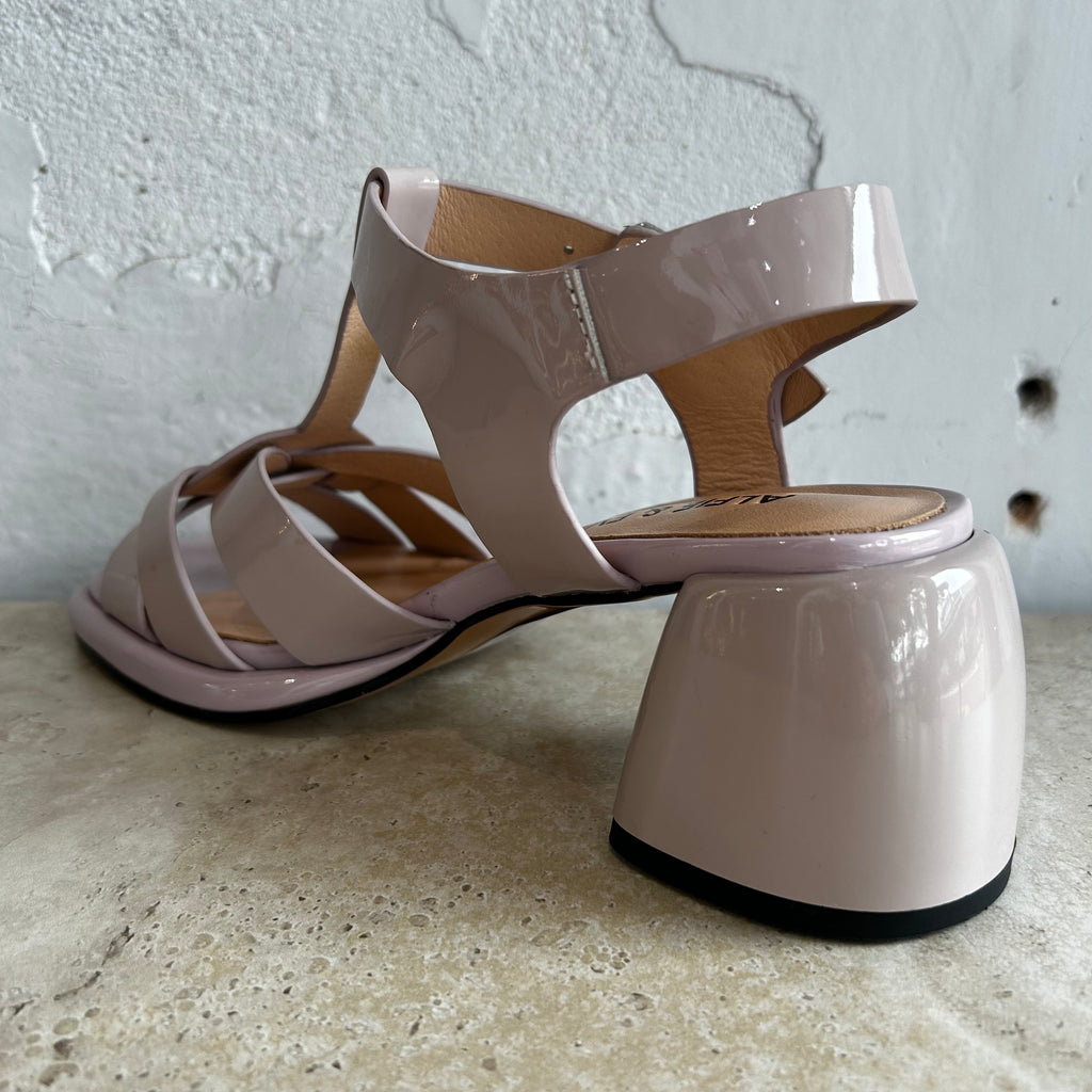 Step into statement style with United by Alfie & Evie — a modern heel that blends playful charm with elevated sophistication. Crafted in lilac patent leather, this sandal features a distinctive strappy upper with a circular central motif and a bold buckle strap for a secure fit. The 6cm block heel offers the perfect balance of height and comfort, making it ideal for both day-to-night dressing.