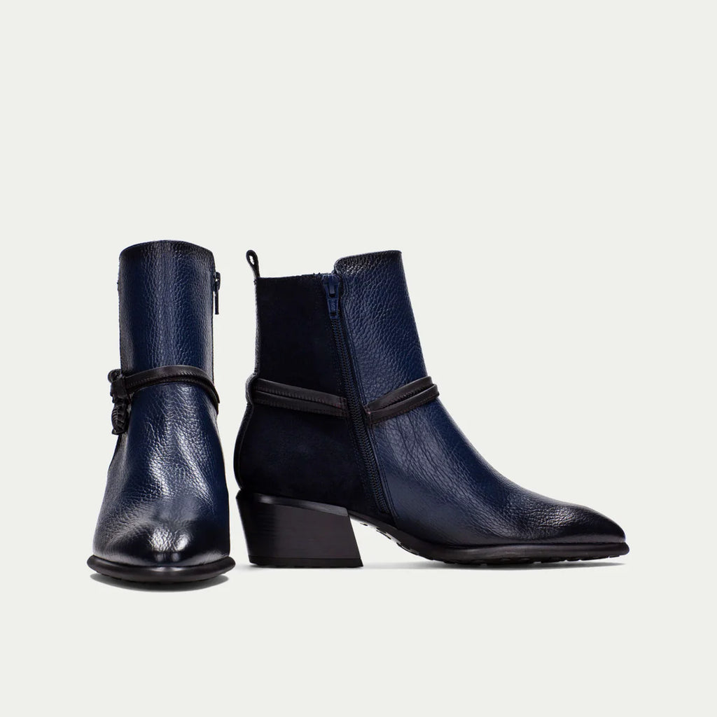 Hispanitas PHI254297 women's ankle boot in midnight. Give your outfit a bold twist with these trendy ankle boots from the Spanish brand Hispanitas. Crafted from tumbled leather and suede, the shaft features a leather strap and a metal buckle. The sturdy heel is 4 cm high. The boot closes with a zipper.