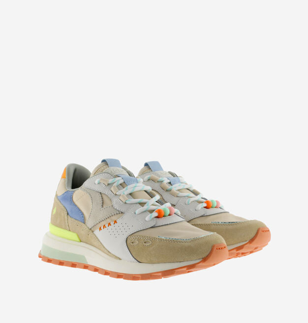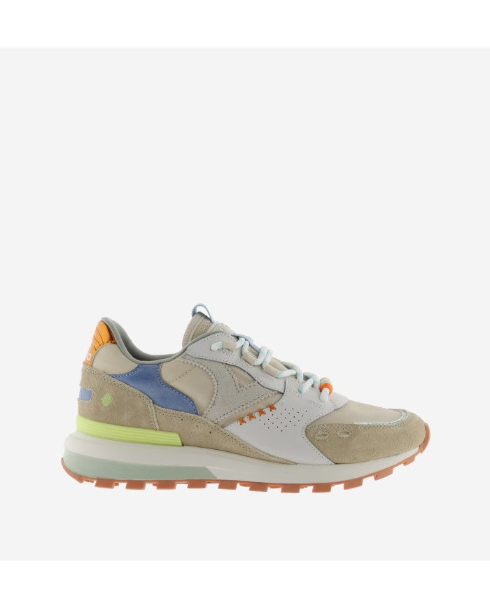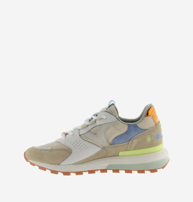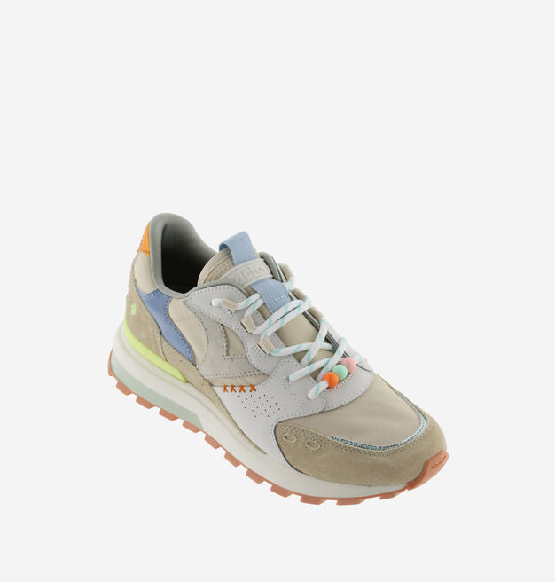 Multicolored sneaker in pastel tones, designed to bring softness and style to any look. They incorporate unique details in stitching, decorative beads and rounded laces that add a distinctive touch. Their mix of colors and textures makes these sneakers a versatile and modern option for everyday wear.
