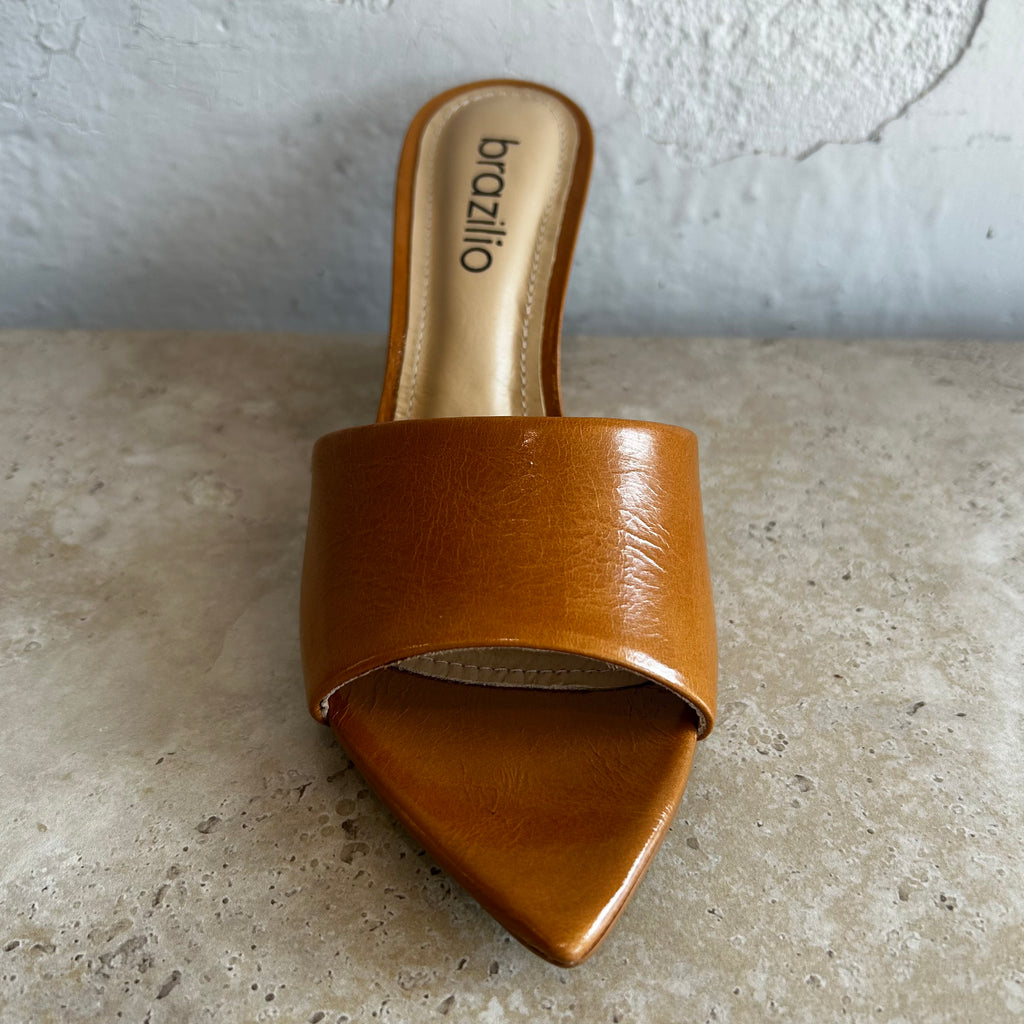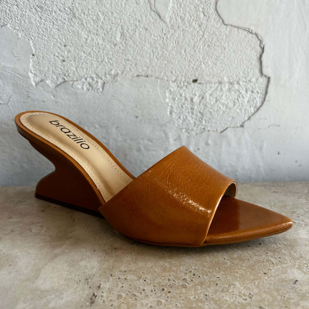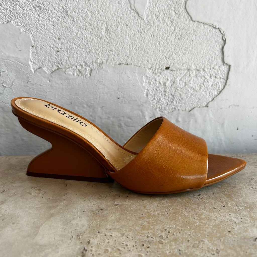 Make a bold impression with this striking sculptural mule by Brazilio. Set on a distinctive curved heel, this slide blends modern artistry with everyday wearability. Crafted in soft leather with a wide strap across the foot, it offers a secure fit and sleek silhouette. Perfect for those who love a statement shoe that doesn’t compromise on sophistication.