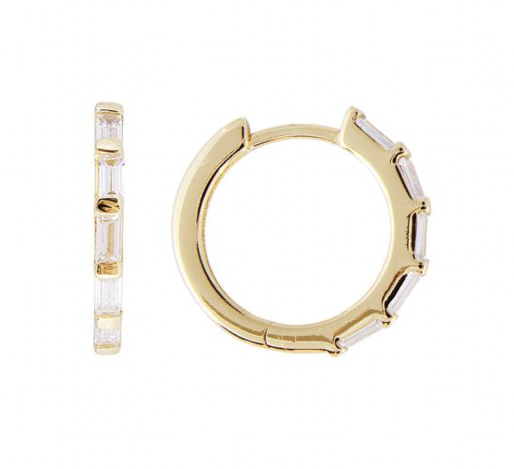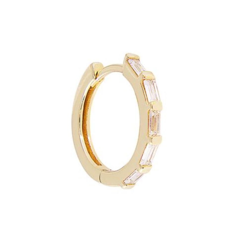These simply stunning finer mid size hoops comprise sparkling CZ baguette stones set in recycled sterling silver 18k gold plate. An elegant everyday extremely light weight hoop that goes with everything.