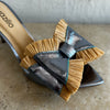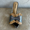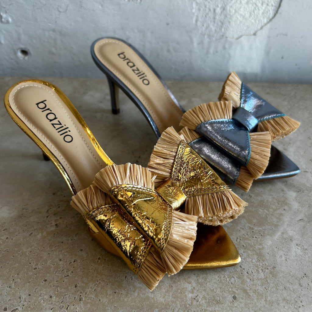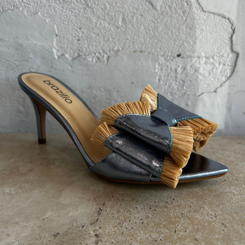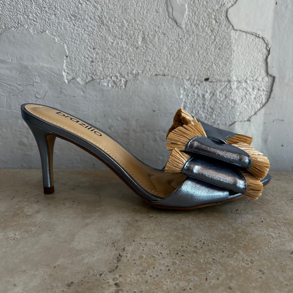 Make a statement with every step in these exquisite Brazilio mules. Drenched in a luminous light blue metallic finish, this elegant heel blends modern glamour with playful texture. The sleek pointed open toe and slim stiletto heel create a refined, feminine silhouette, while the layered raffia bow detail adds a unique artisanal touch.