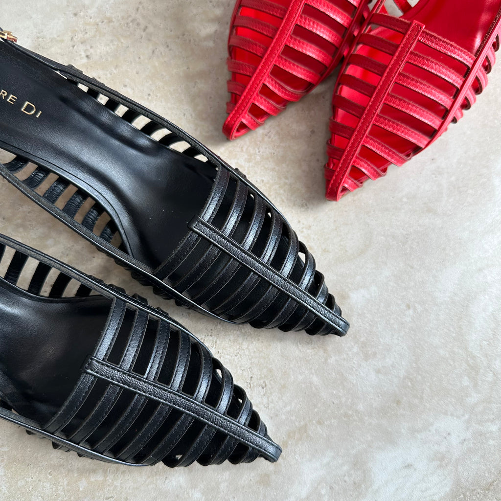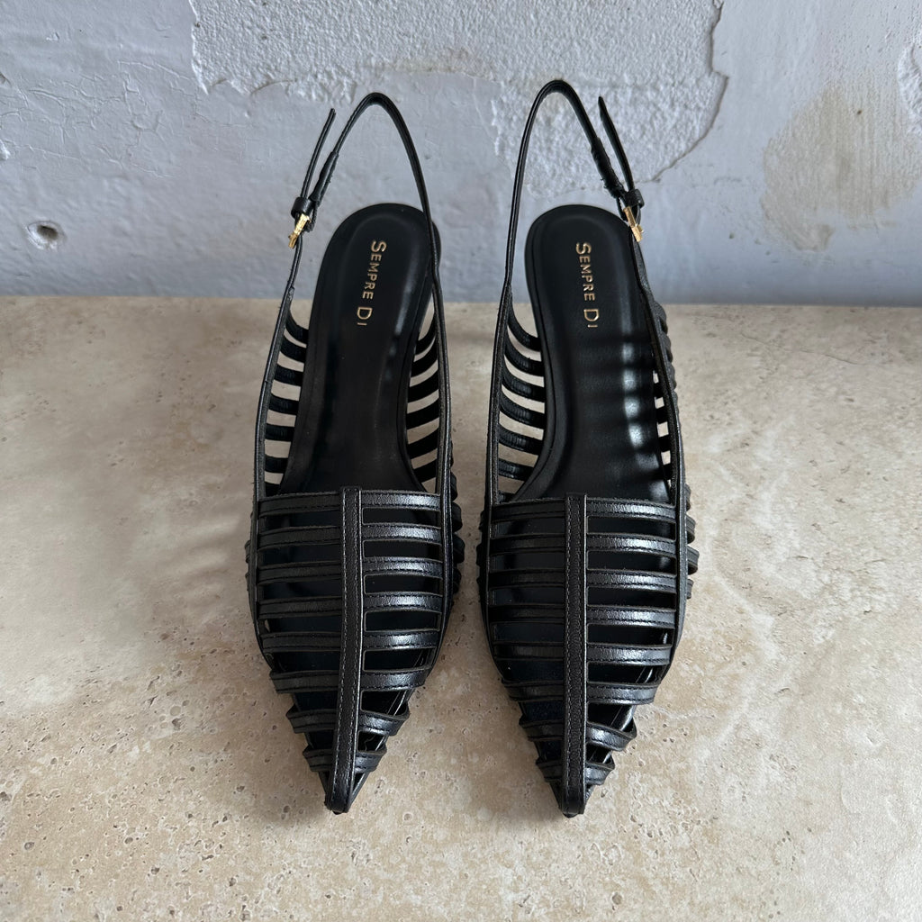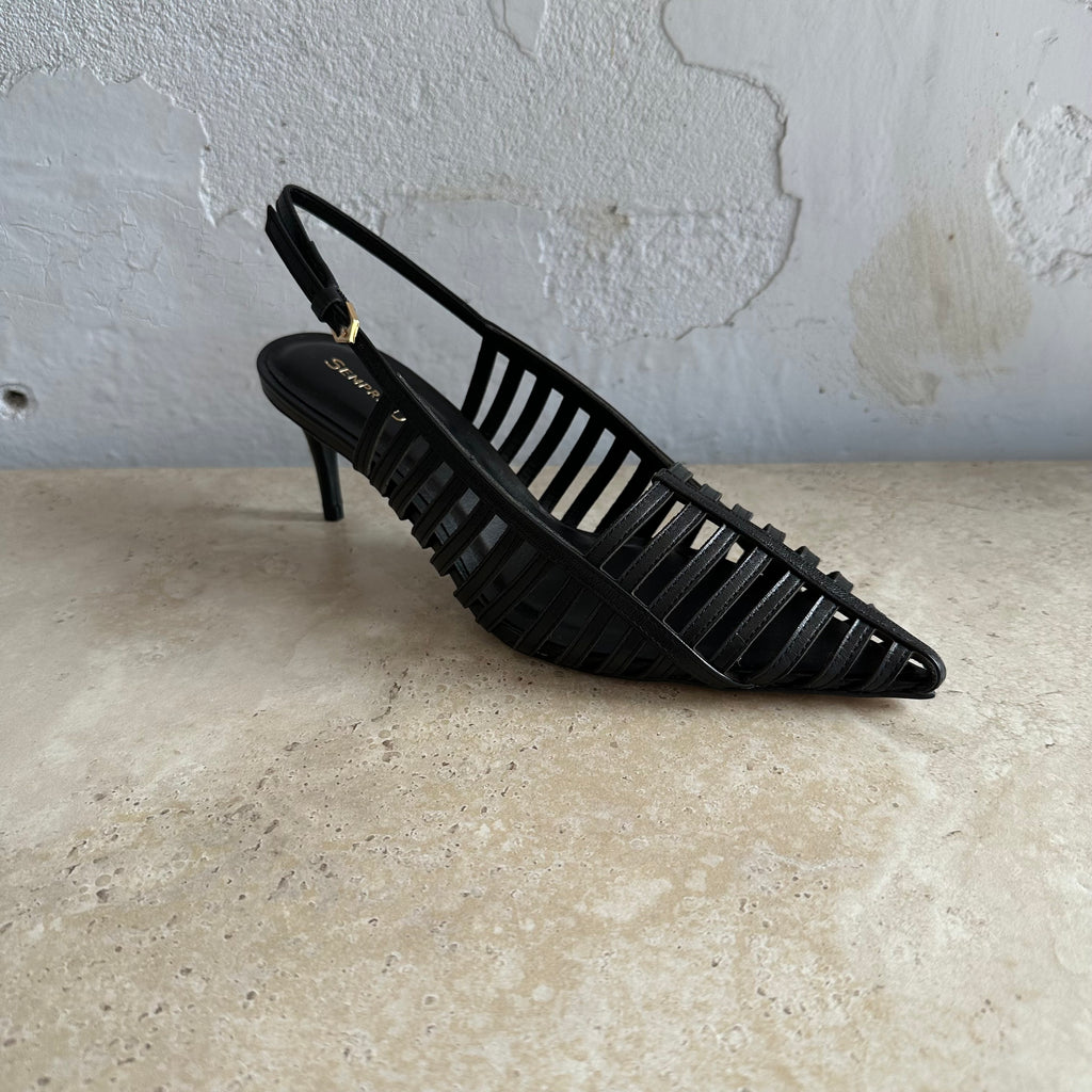 Sempre Di Style 439002 is a striking expression of Brazilian craftsmanship and modern design. Made in Brazil, this sandal features a bold caged leather upper that elegantly frames the foot, balanced by an 7cm thin heel for both height and stability. The pointed toe shape adds a touch of sophistication, while the adjustable slingback strap ensures a secure and comfortable fit. Perfect for day-to-night wear, this style blends contemporary edge with timeless elegance.