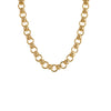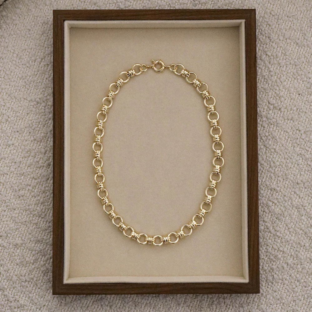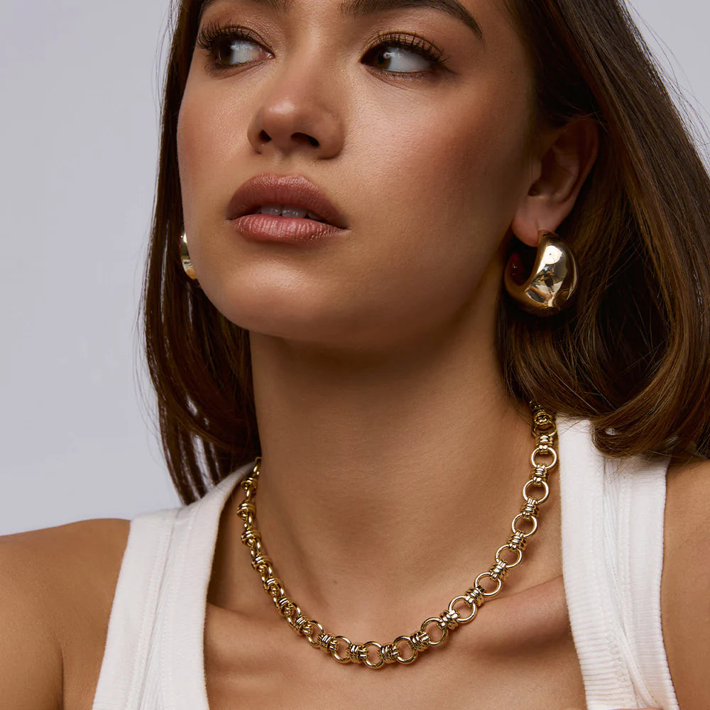 The Lesley Necklace by Zahar features interlinked gold-toned circles, each accented with detailed knot-style wraps for a textured, dimensional finish. Eye-catching yet elegant, this piece is perfect for layering or wearing solo as a statement.